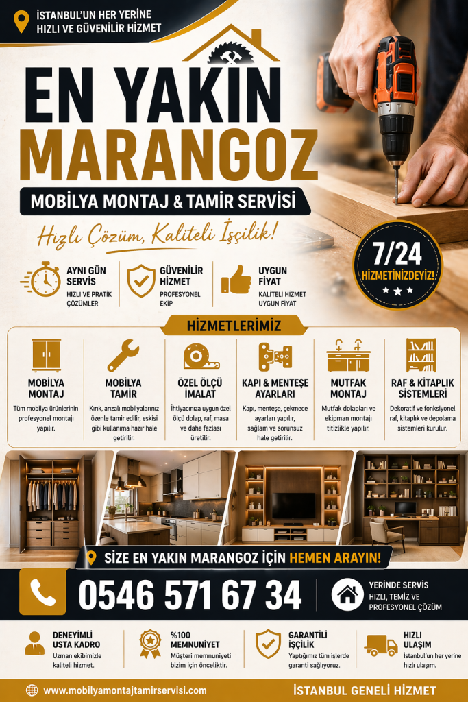 En yakın marangoz hizmeti, mobilya montaj ve tamir işlemlerinde hızlı ve etkili çözümler sunar. İstanbul genelinde sunduğumuz profesyonel hizmet ile mobilya sorunlarınıza kalıcı çözümler sağlıyoruz.